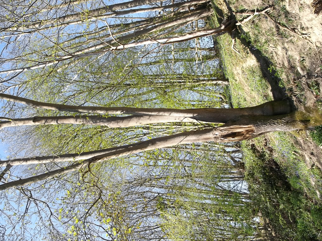 Tree is on north side of track which runs downhill from gate (main entrance). Tree on bank approx 50m from spring. Tree has two trunks because double planted – gap between trunks between 10 and 60cm above ground. Third trunk on south side of tree has broken off to leave large scar, other trunks fork. Bark ridged, deep fissure above gap marks junction of two trees.