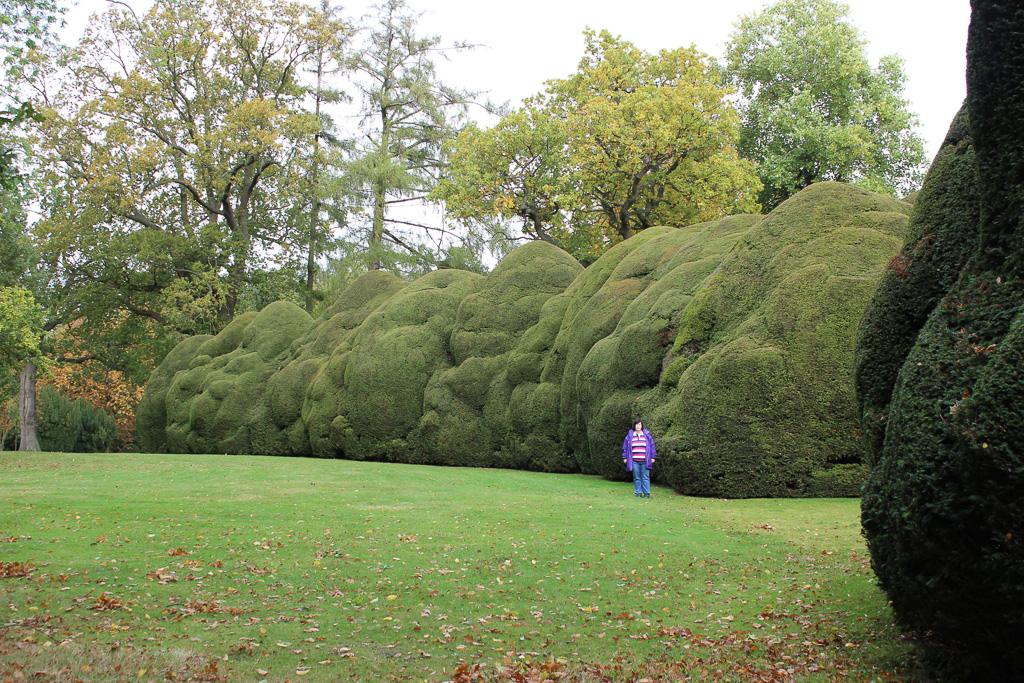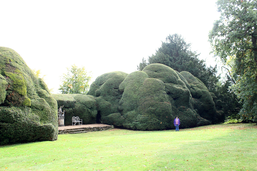 ‘The Cloud Yew Hedge’. This is one of a number of very large yew hedges in Doddington Place and is situated in the garden. Head Gardner Lucy Adams told me that the yew hedge originally was clipped back but with the outbreak of war, the gardners joined the services and the hedge became overgrown. However, the owner, Mrs Douglas Jeffreys, liked the look of the overgrown hedge and it has remained in this shape with only maintenance trimming ever since. There are approximately 110 yew trees in the hedge. It is possible to walk inside the hedge. Mrs. Douglas Jeffreys (nee Oldfield) was responsible for much of the architectural detail and layout of the heart of the garden. She lived in the house from 1906 until her death in 1954.
