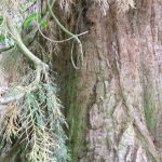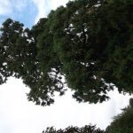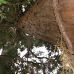 One of two trees this one is to the east.Branches start at 4m above ground and hang to the ground.Fissured bark with small holes where tree creepers roost.