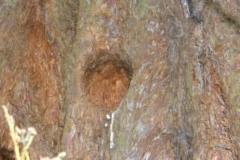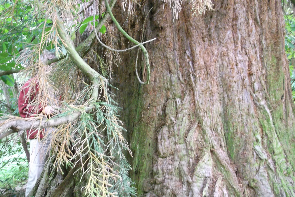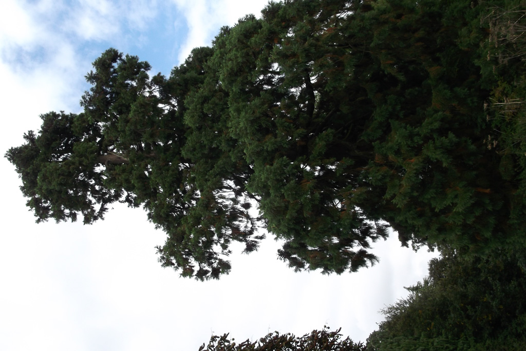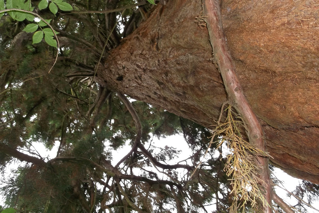One of two trees this one is to the east.Branches start at 4m above ground and hang to the ground.Fissured bark with small holes where tree creepers roost.