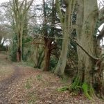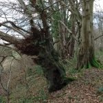 Old boundary line of trees on the downslope boundary of Warren Wood. Includes Yew, Beech, Cherry and Hornbeam. These 2 Hornbeams are adjacent in the boundary line about 2m apart.