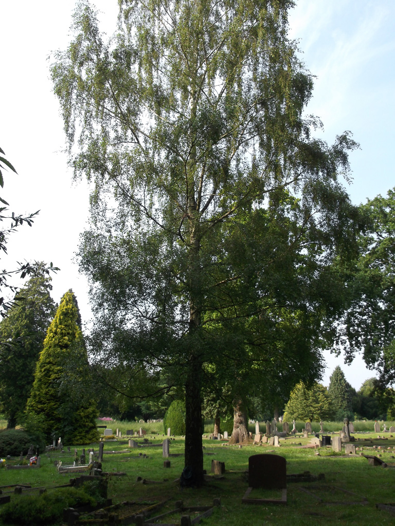 In cemetery section 112. Silver birch with slightly drooping branches. Large root system Fissured bark but silvery to ground level.