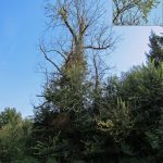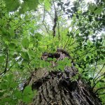 A PAIR of Field Maidens at the boundary of a meadow. Apparently these elms were in rude health until only a few years ago, since when they have been ravaged by disease and crown die-back. The northerly-most example has sheered off at around one third its original height girths are 290cm (broken) and 352cm (standing). Curiously, both elms have abundant epicormic growth and the larger of the two has remnant thin growth at the crown so they are putting up a fight. There are numerous self-seeded younger trees and saplings within the underwood. These two near-skeletal examples are lost to view in dense underwood as you approach more closely along the public path. The clearer view is from private land (permission is needed). Leaves are glossy. Epicormic growth is abundant up the deeply fissured main trunks. Significant cavity rot achieved through age. Dead wood on the ground exhibits a black glossy fungus; bracket fungi on the trunk. Large burrows housing rabbits in the root-system. Smooth-leaved elm.