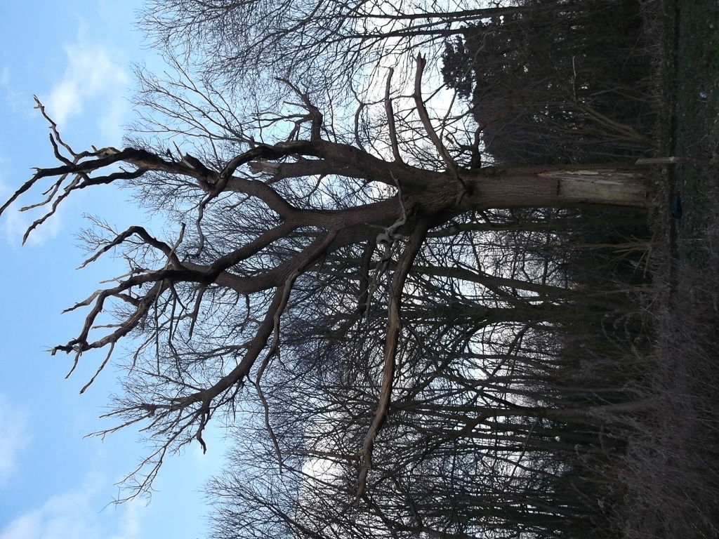Tree on north side of track from car park where ride branches to south. Bark missing on south(track) side over 1/4 of trunk to height of 2m. Heartwood exposed and rotting. Many branches dead or dying with missing bark. Branches broken at ends in crown or have bark missing on parts, but new growths from break points on branches. Bark deeply ridged. Trunk forks into 5 at 5m.