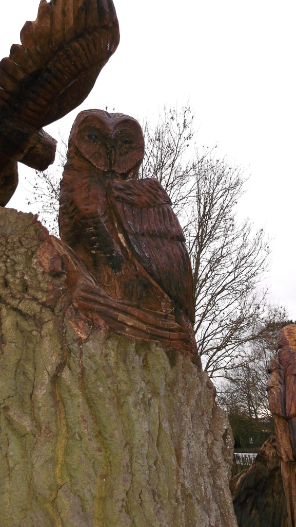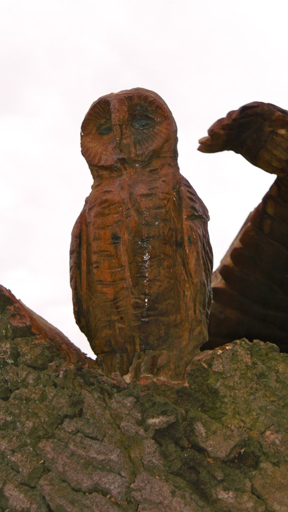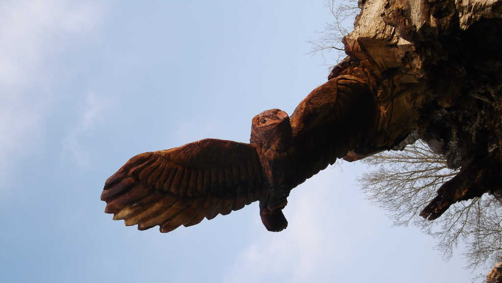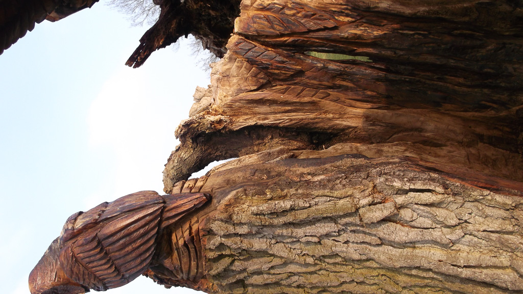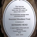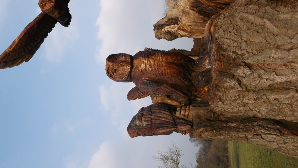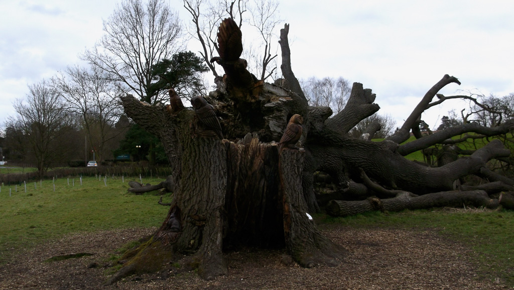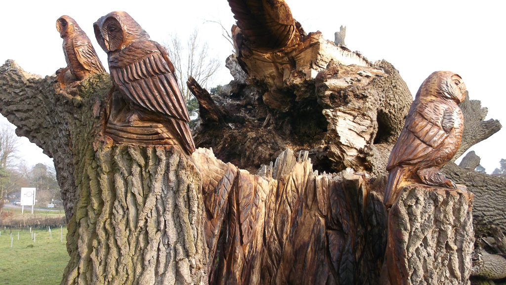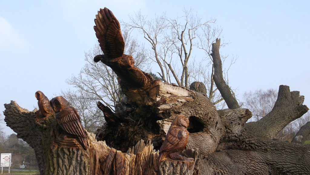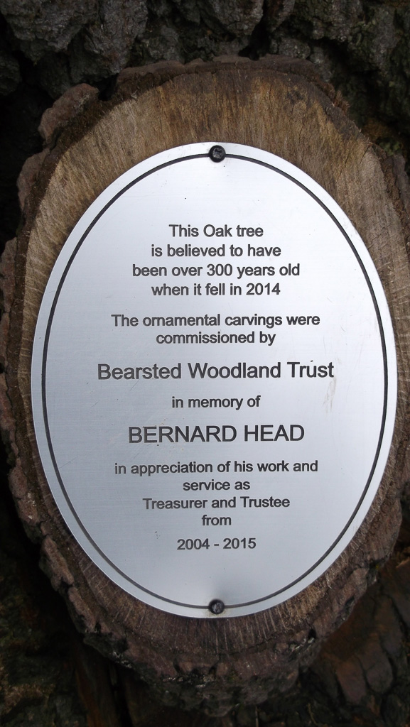 In the summer of 2015 the stump and part of the base of the broken trunk was carved to represent a group of owls, three sitting on the stump, one flying from the base of the broken trunk. The interior of the hollow stump was carved to represent feathers, and around the outside of the stump were carved the head of a badger, a rabbit, and some steps. These were dedicated to Bernard Head who had been the treasurer of the Bearsted Woodland Trust on whose land the tree grew. The photographs show the carvings, fallen tree and stump and were taken on 8 and 11 March 2016 by Stephen Foster..