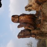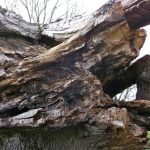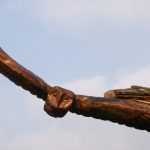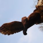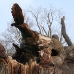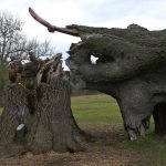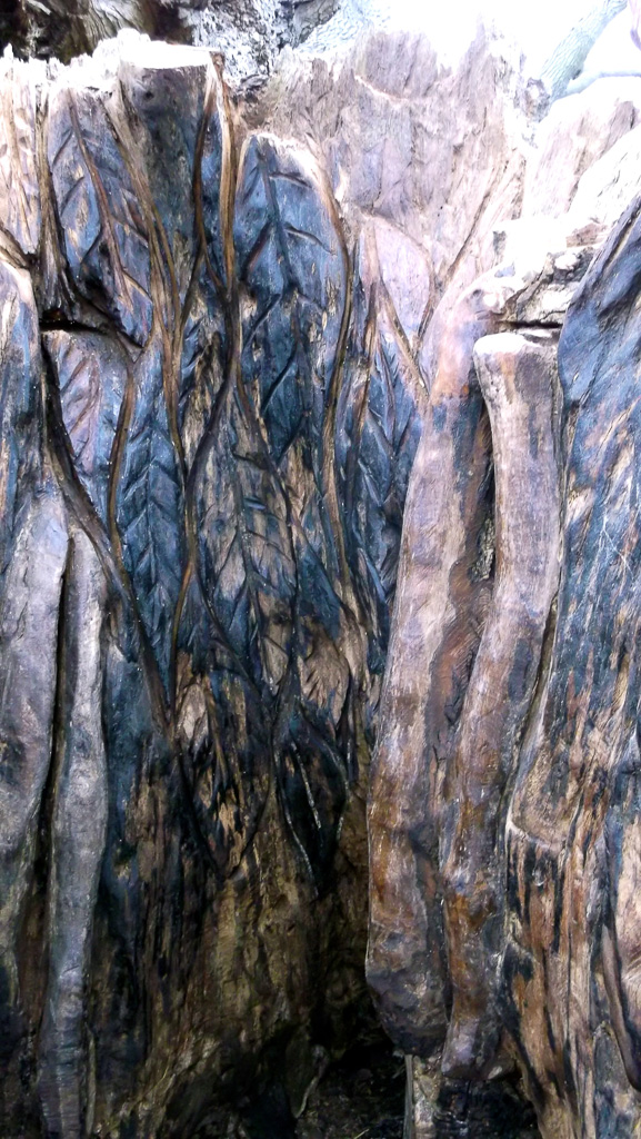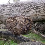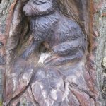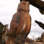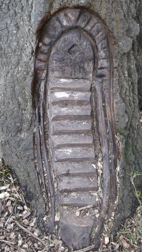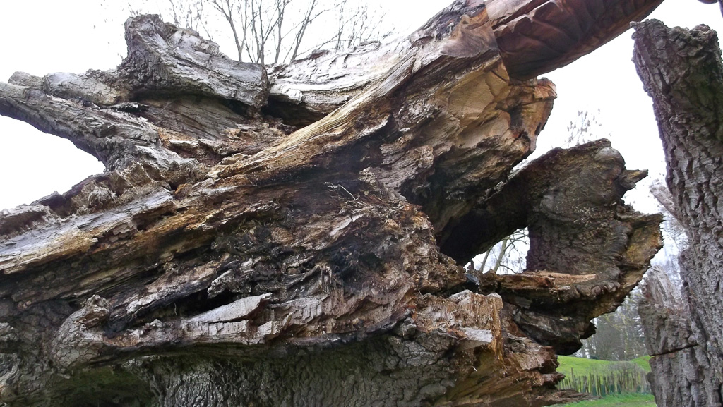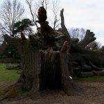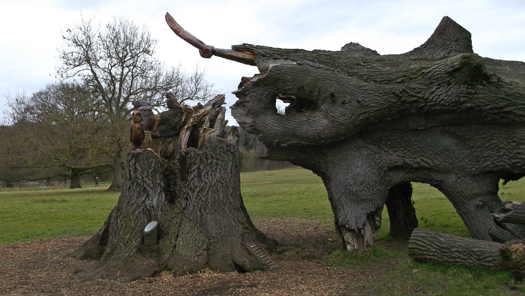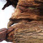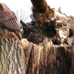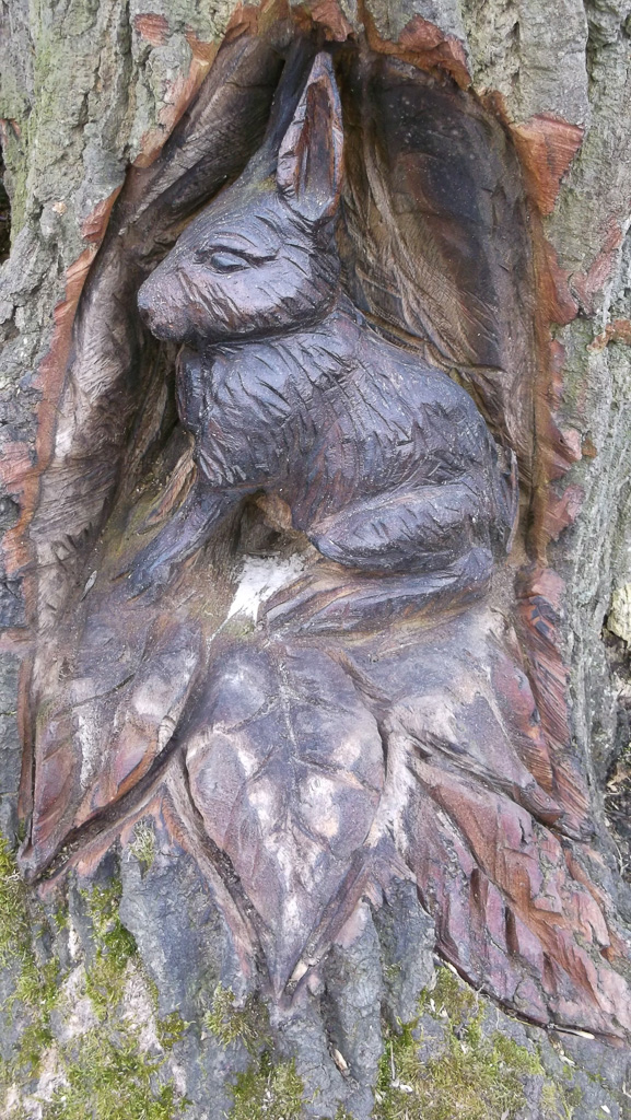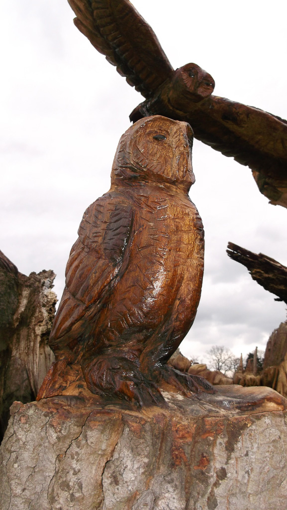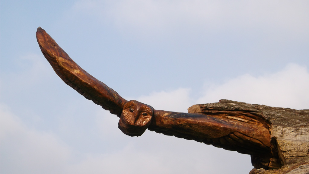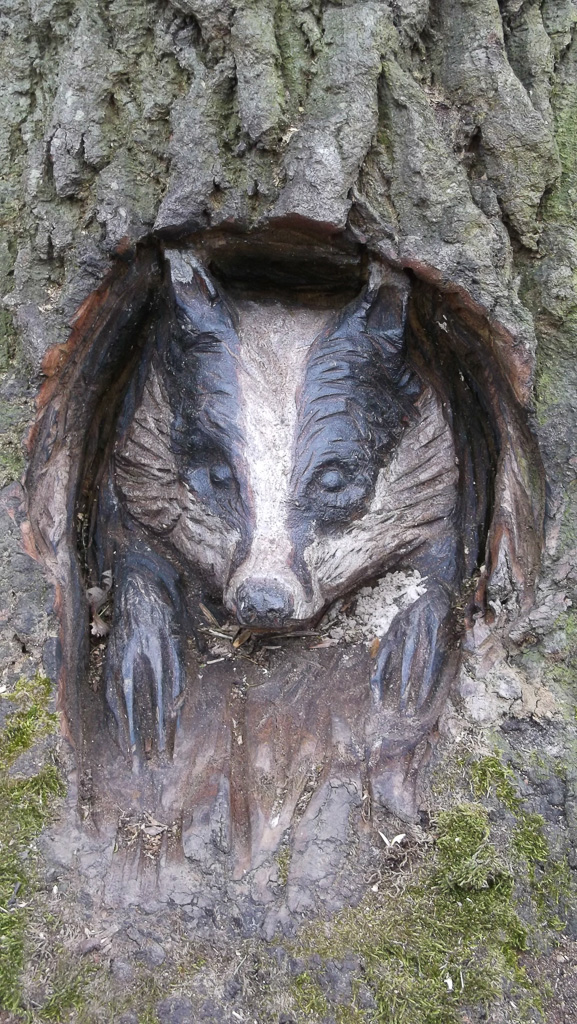 In the summer of 2015 the stump and part of the base of the broken trunk was carved to represent a group of owls, three sitting on the stump, one flying from the base of the broken trunk. The interior of the hollow stump was carved to represent feathers, and around the outside of the stump were carved the head of a badger, a rabbit, and some steps. These were dedicated to Bernard Head who had been the treasurer of the Bearsted Woodland Trust on whose land the tree grew. The photographs show the carvings, fallen tree and stump and were taken on 8 and 11 March 2016 by Stephen Foster..